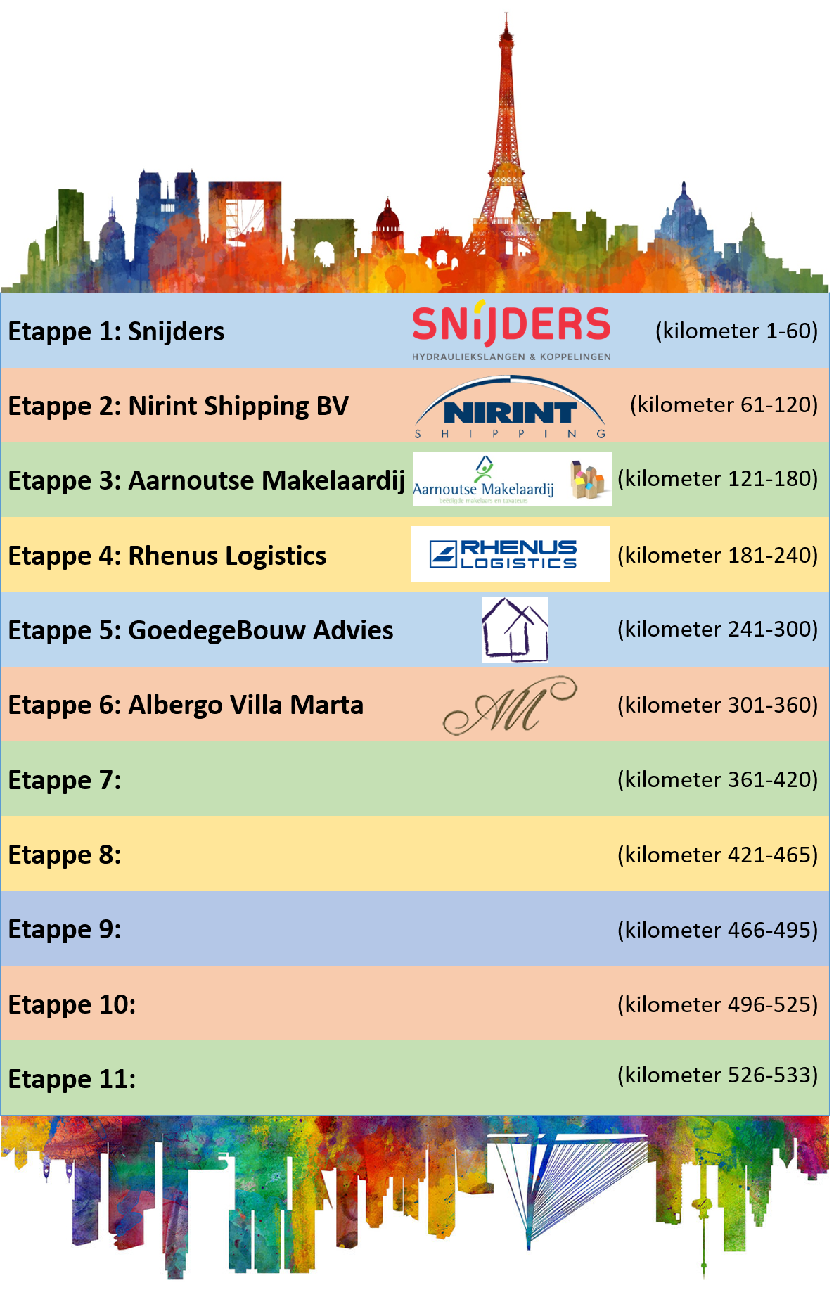 Er zijn weer 2 etappes gesponsord en een ervan zelfs vanuit Italië! Bouwkundig adviesbureau GoedegeBouw Advies sponsort onze 5e etappe en Albergo Villa Marta uit Lucca (Italië) de 6e etappe.